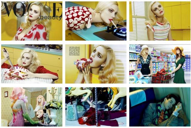 Bianca Carminati (1) analisou a produção fotográfica de Miles Aldridge considerando que o mesmo deixou a humanidade de lado pelas cores fortes e contrastes que se manifestam em suas famosas fotografias.